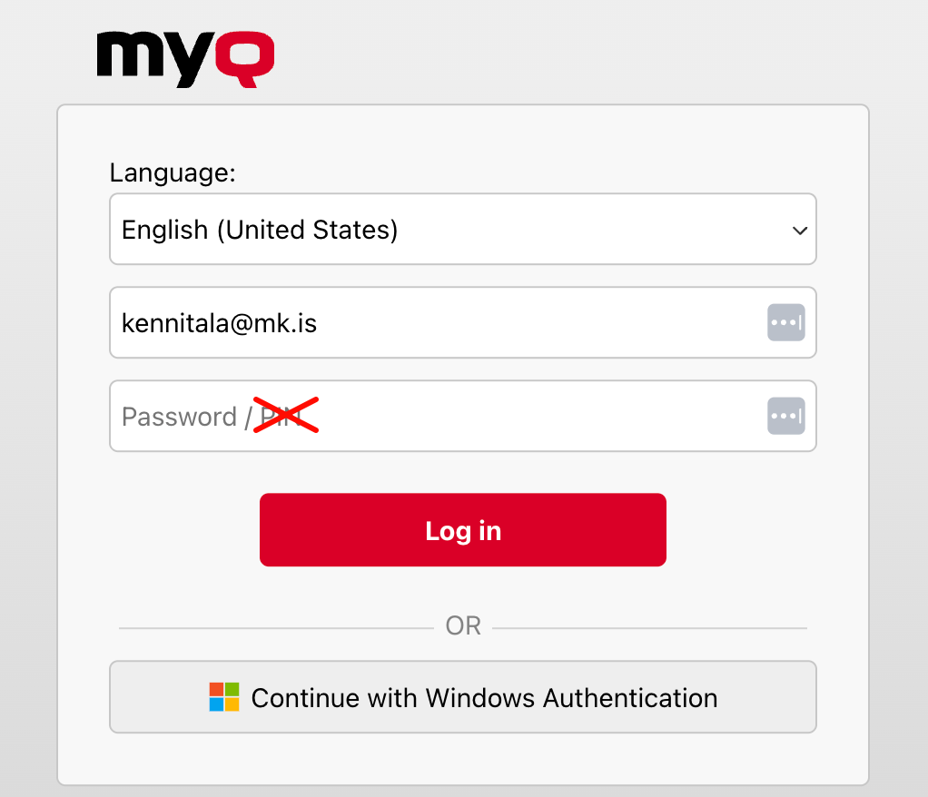 Password: mk lykilorð, ATH pin(fyrstu 8 stafir í kennitölunni) virka ekki á vefsíðunni, bara í prentaranum.